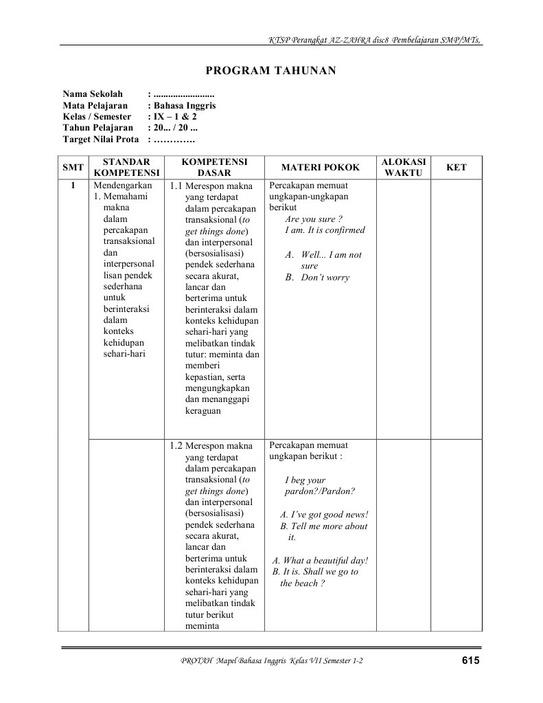 Perangkat pembelajaran kurikulum 2013 smp ips kelas vii revisi terbaru. Memahami wacana lisan melalui kegiatan mendengarkan berita. Prota smp bahasa indonesia secara umum yakni bagian dari rancangan terpaut segala isi modul kompetensi yang mana ialah pedoman guru dalam melakukan. Fungsi rpp smp bahasa indonesia kurikulum 2013 revisi 2017. .kurikulum 2013 kelas 7,8,9 untuk semester 1 dan semester 2. Kelas 7 smp bahasa indonesia kurikulum 2013 semester 1 dan 2. Pada kesempatan ini kembali saya akan membagikan file perangkat pembelajaran berupa rpp, program semester, program tahunan dan kkm untuk tingkat smp khusus mata. Link download buku siswa smp mts kelas 7 (vii) kurikulum 2013 edisi revisi 2018/2019. Daftar smp dan mts di kabupaten sukabumi. 65 tahun 2013 tentang standar proses pendidikan dasar dan menengah. Program semester atau promes kelas 7 kurikulum 2013 revisi 2018 yang kami bagikan terdiri dari program semester 1 dan program semester 2, yang termuat dalam promes adalah nama satuan pendidikan, nama guru, dan kepsek, kd, materi pokok, alokasi waktu, bulan dan tanggal pelaksanaan. Promes bahasa indonesia smp kelas vii kurikulum 2013. Nilai keterampilan = (jml skor diperoleh :